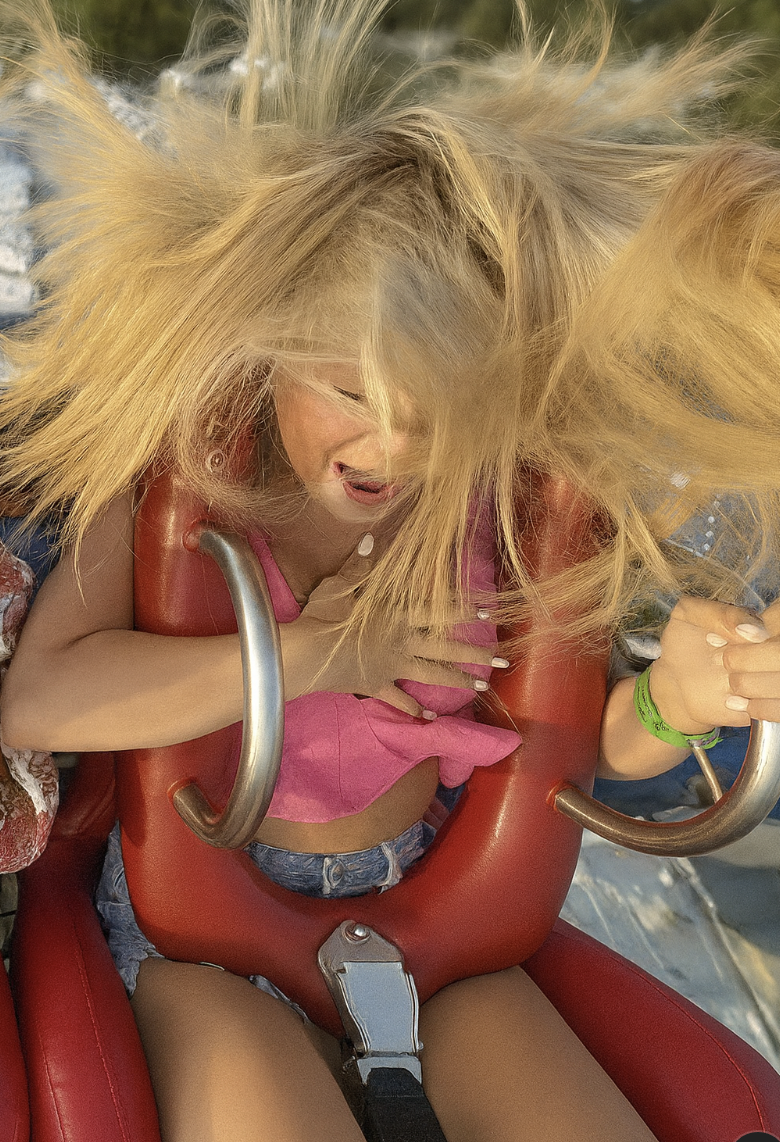 Vanaf de eerste seconde dat ze de lucht in schiet, verandert haar expressie compleet. De combinatie van kracht, snelheid en onverwachte bewegingen zorgt voor een oprechte en pure reactie die je niet kunt faken. Iedereen die ooit in een extreme attractie heeft gezeten, herkent die typische mix van verbazing, spanning en onverwachte reflexen. Terwijl de G-krachten aan haar trekken, probeert ze grip te houden op haar kleding die door de wind alle kanten op wordt geblazen. Ze probeert alles onder controle te houden, maar de natuurkrachten spelen hun eigen spel. Het levert een bijna filmisch tafereel op waarin haar focus volledig verschuift: van genieten van de rit naar proberen overeind te blijven tijdens een intens gevecht tegen de elementen.